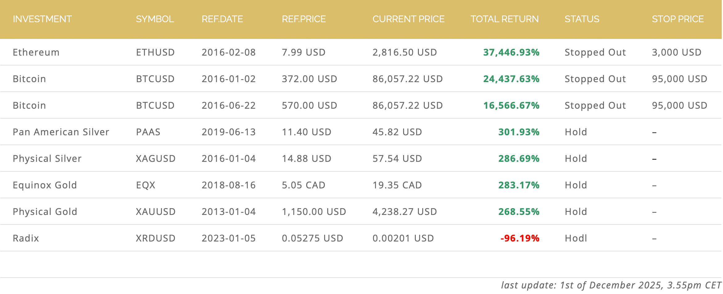 While our main focus currently is on the precious metal sector including mining stocks and on bitcoin and other crypto currencies we do track all markets worldwide and are always in search of excellence and therefore lucrative ideas & opportunities. We approach the markets from an objective rational and risk averse point of view and avoid any bias towards long or short.