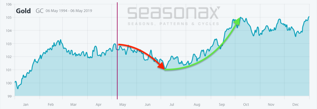 If you consider the four ratio components of the Midas Touch Gold Model™, none of them is screamingly bullish at the moment. In fact, the Dow Jones/Gold-Ratio is rather close to lose its bullish signal! But should the “sell in May cycle” plus the US-China trade dispute force stock markets lower, this power ratio would remain in favor of gold. The other three ratios (Gold/Silver-Ratio, Gold/Oil-Ratio, Gold/Commodities-Ratio) will likely catch up once gold has seen its trend reversal in the next few months.